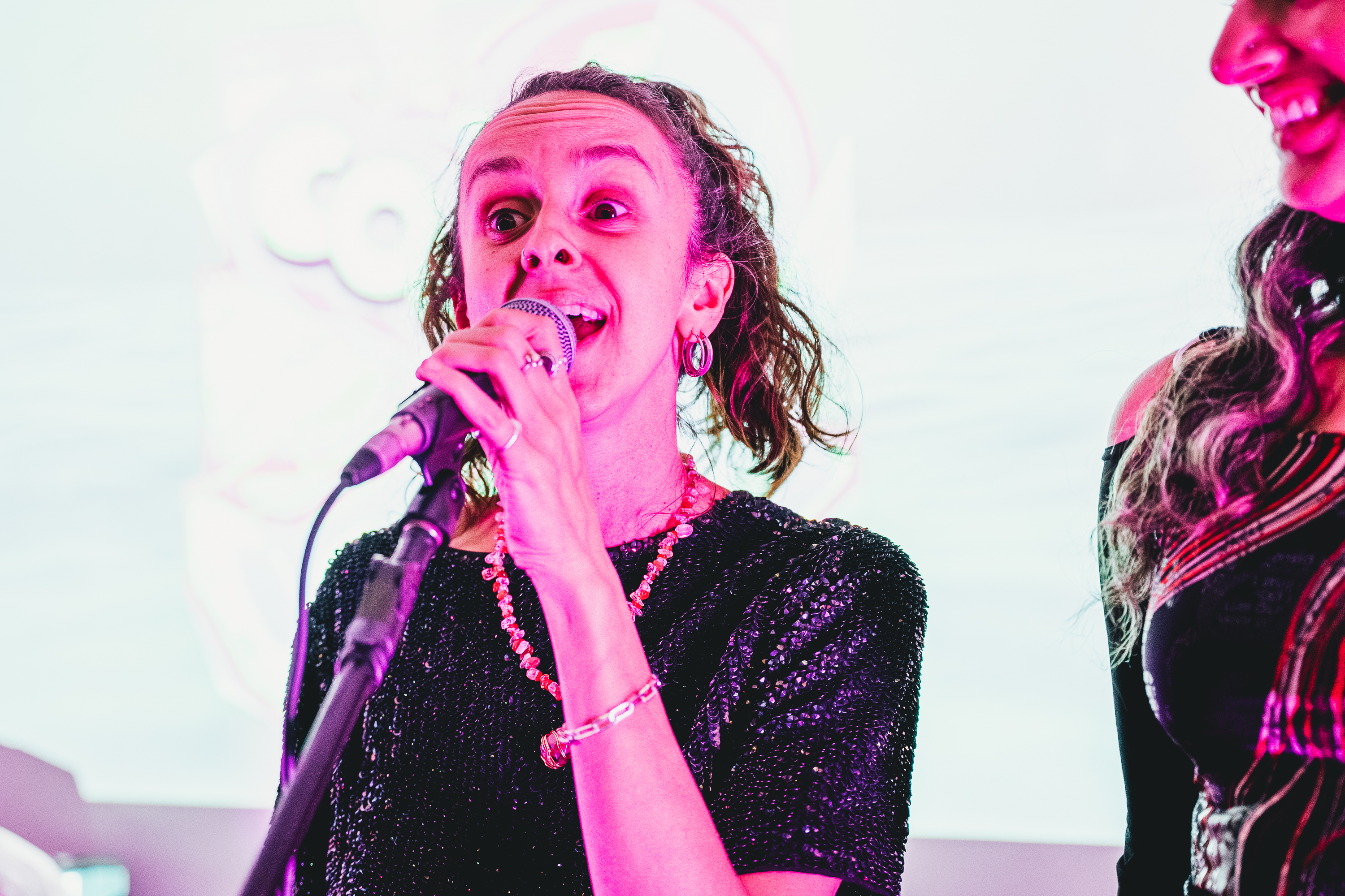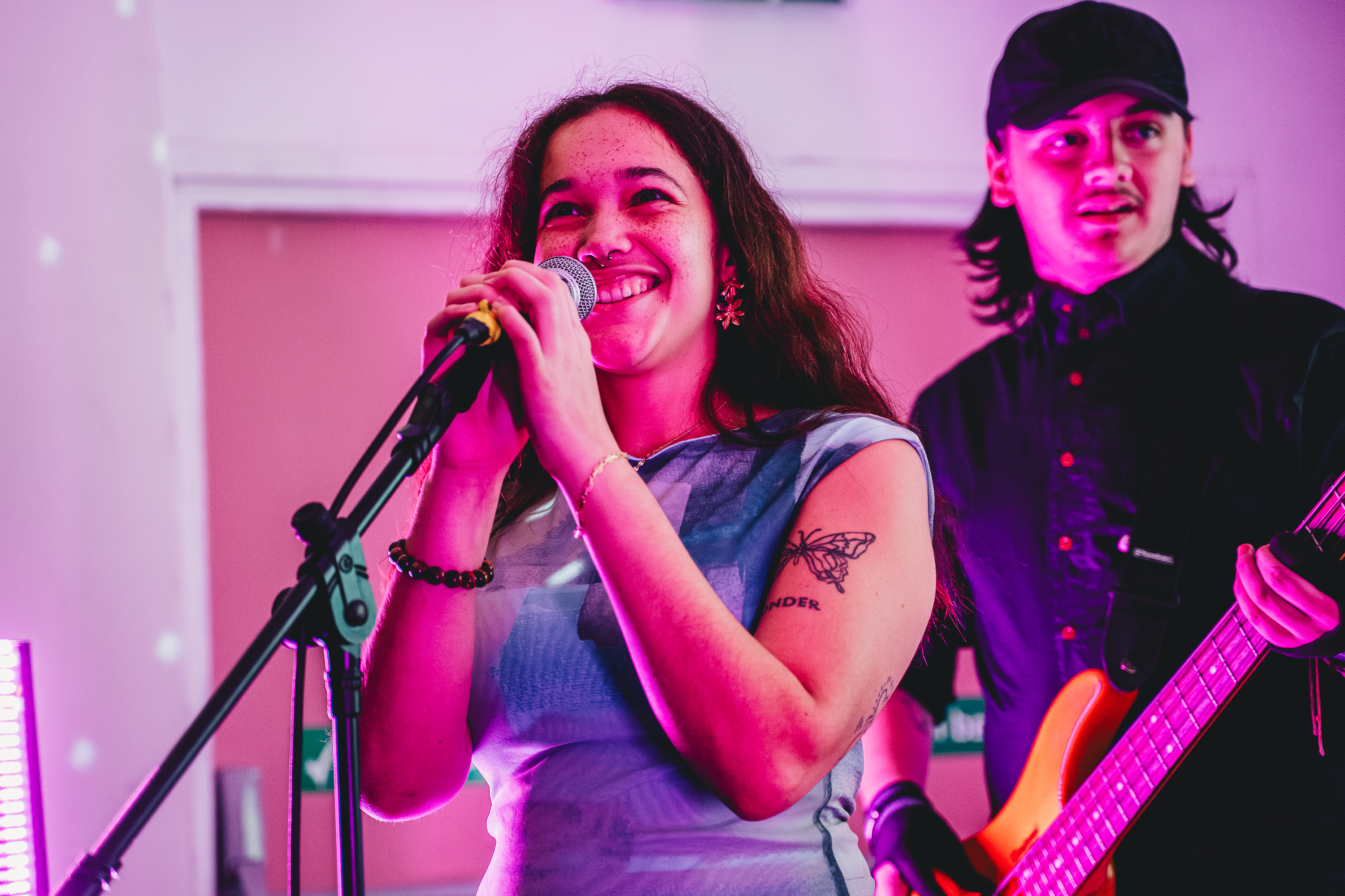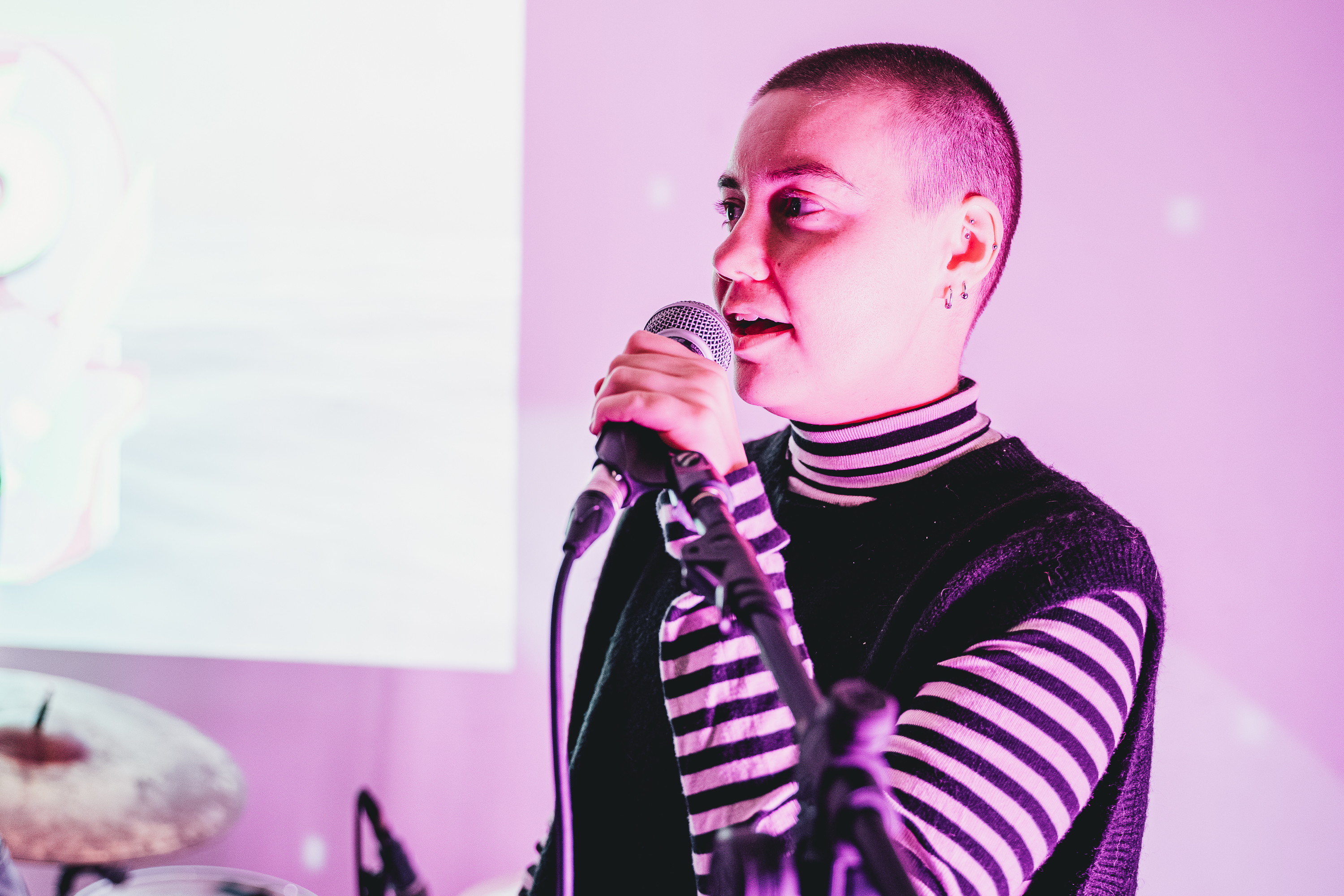 Next up, it was time for a bit of "riot grrrl" inspired indie with Romy and Hailey backed up by Aaleyah Brown on drums with the raucous Just a Liar. Fossil House followed, which saw Nikki ditch her hosting duties for a moment to perform on stage.