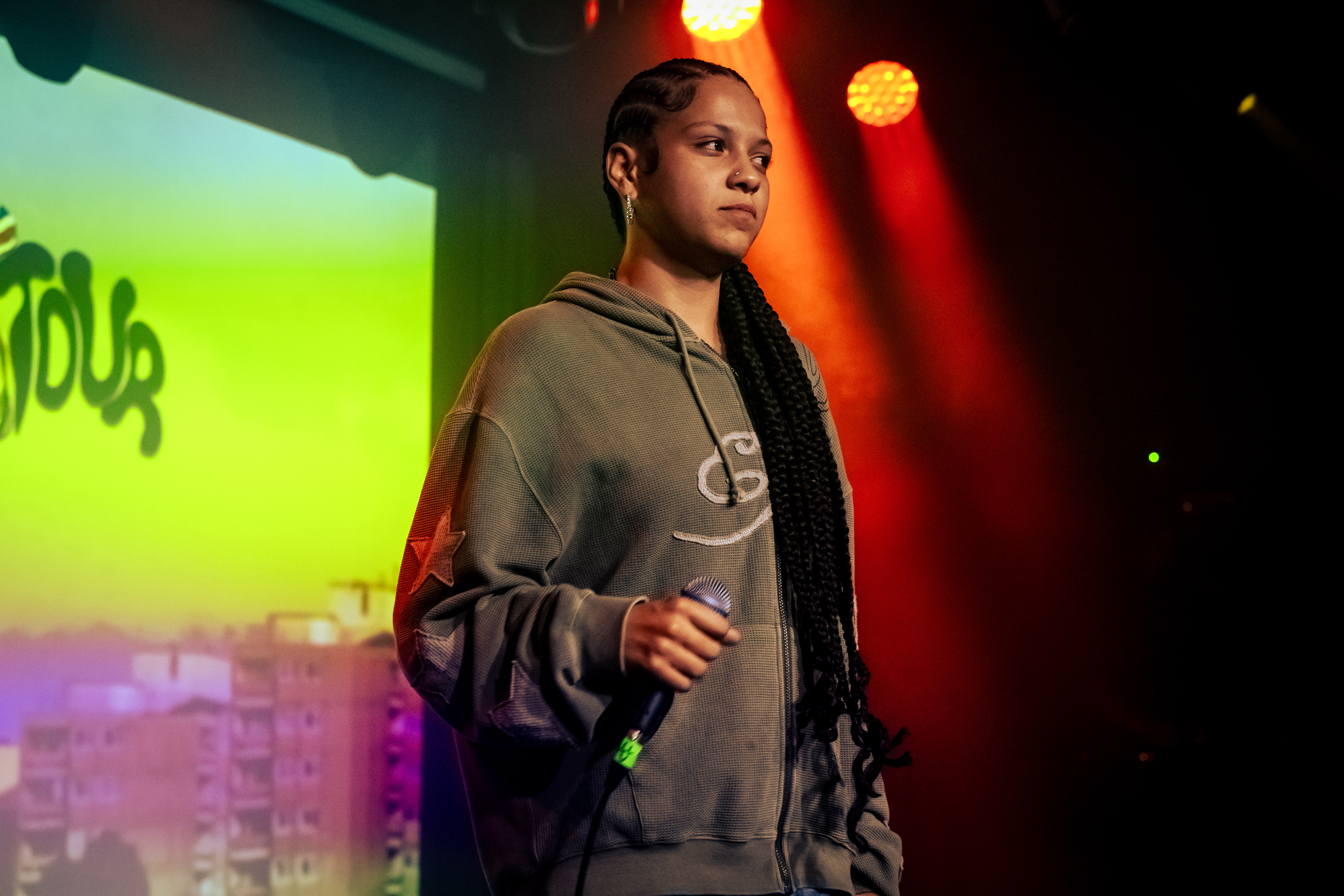 Her set opens with State of the World, a song which demonstrates Jaya’s strength as an introspective rapper. The song settles into itself, opening with an emotive monologue from Jaya’s nan, before going on to discuss the difficulty of trying to find your place in a world that seems to be in such a state. It's a song that seems to say my place in the world is both with you and out there, and I just have to make it, a song that sings true to Jaya’s talent and the triumph she is having with it, while acknowledging the pressures and the anxieties that come with making it.