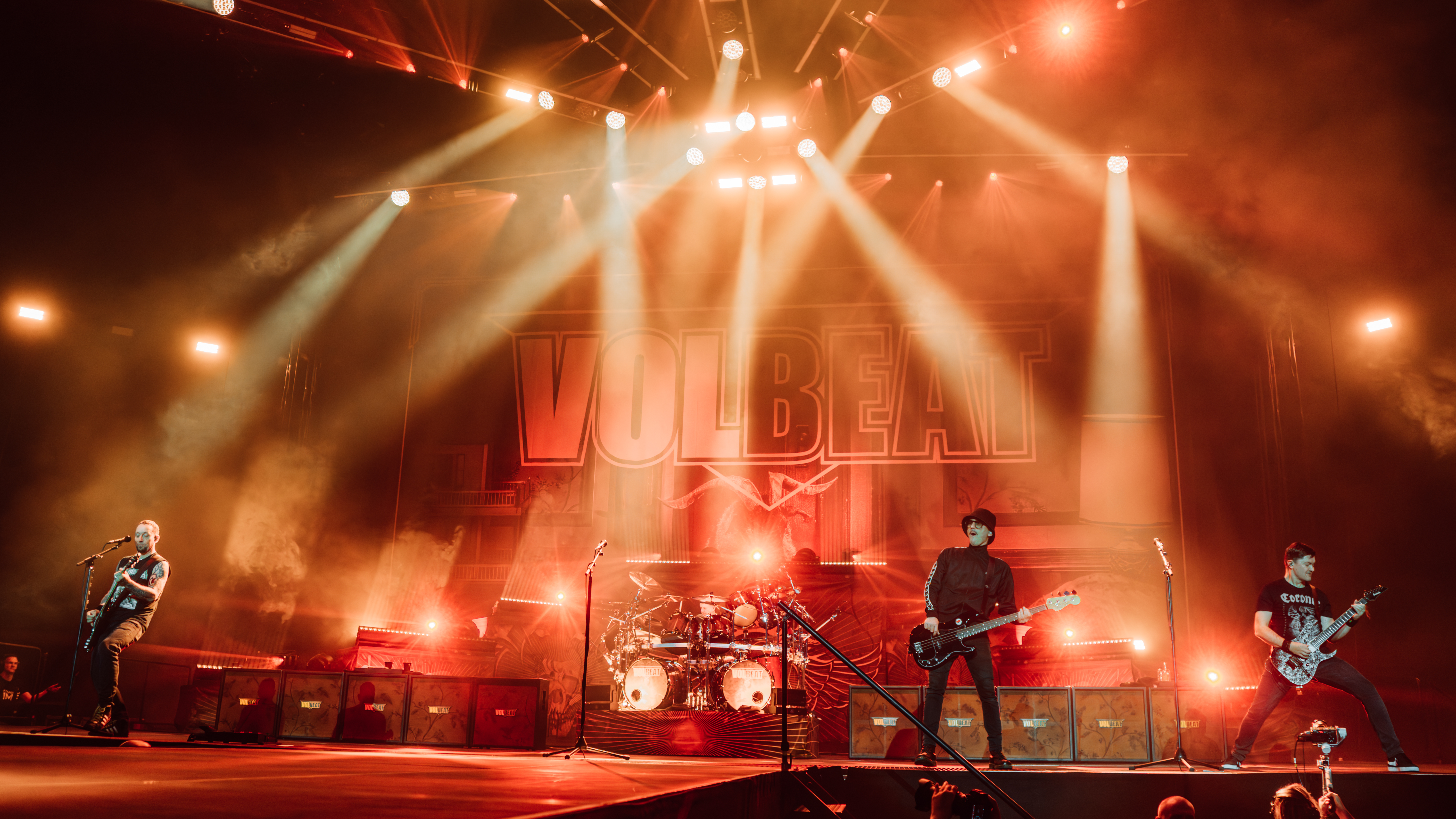 Now, Volbeat. The Danish rock powerhouses were anticipated with an intense and welcoming ferocity from the crowd. Frontman Michael Poulson enters the stage with a beaming smile as he sees the crowd screaming at his arrival; its clear that on the arena stages, Volbeat feel home. This is crystal clear in how they all move about the stage, with Michael singing through six different mics, all positioned at completely different points around the stage, as described earlier, and all of the four members of the band effortlessly gliding around the structure alongside their respective instruments.