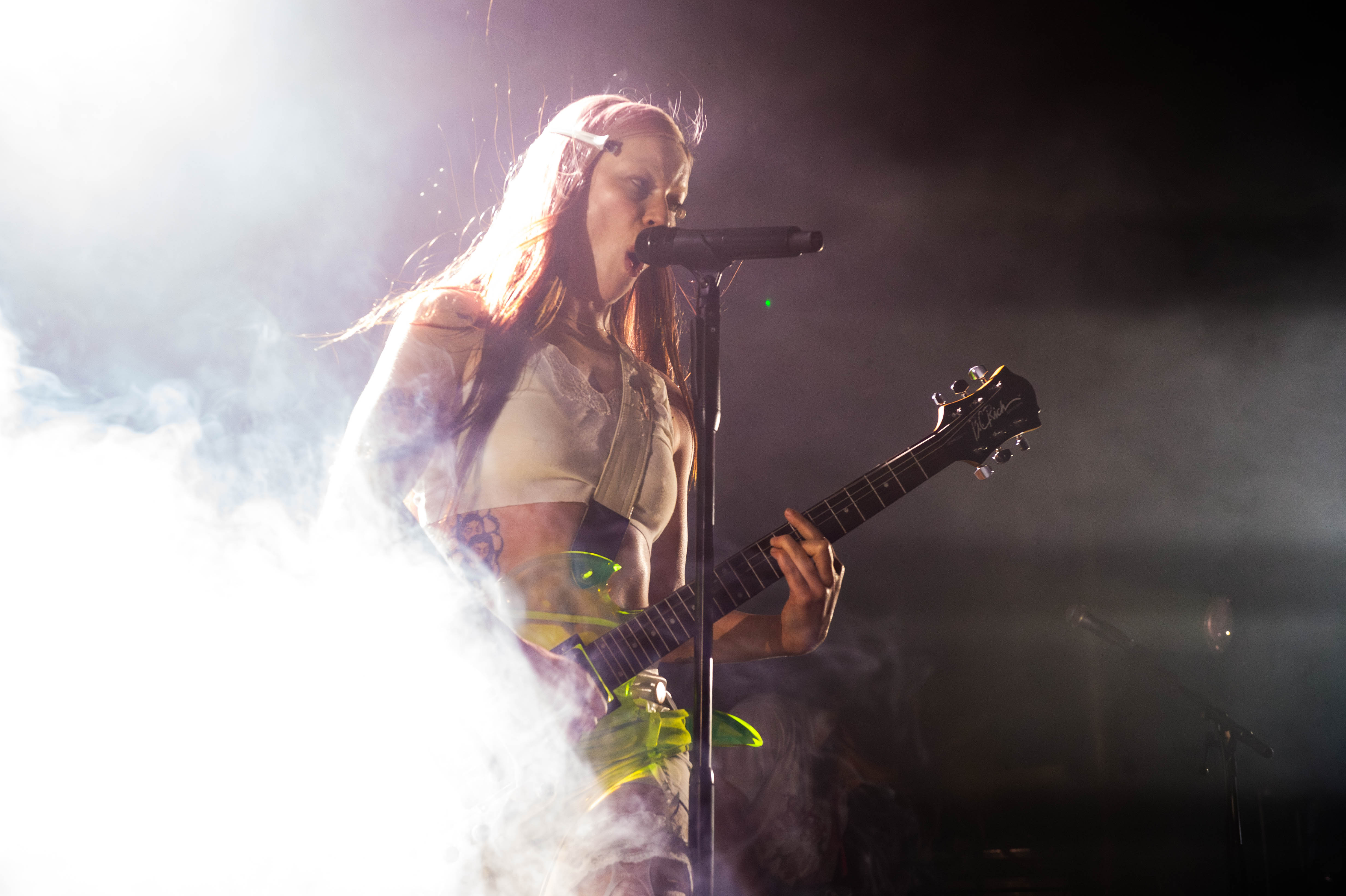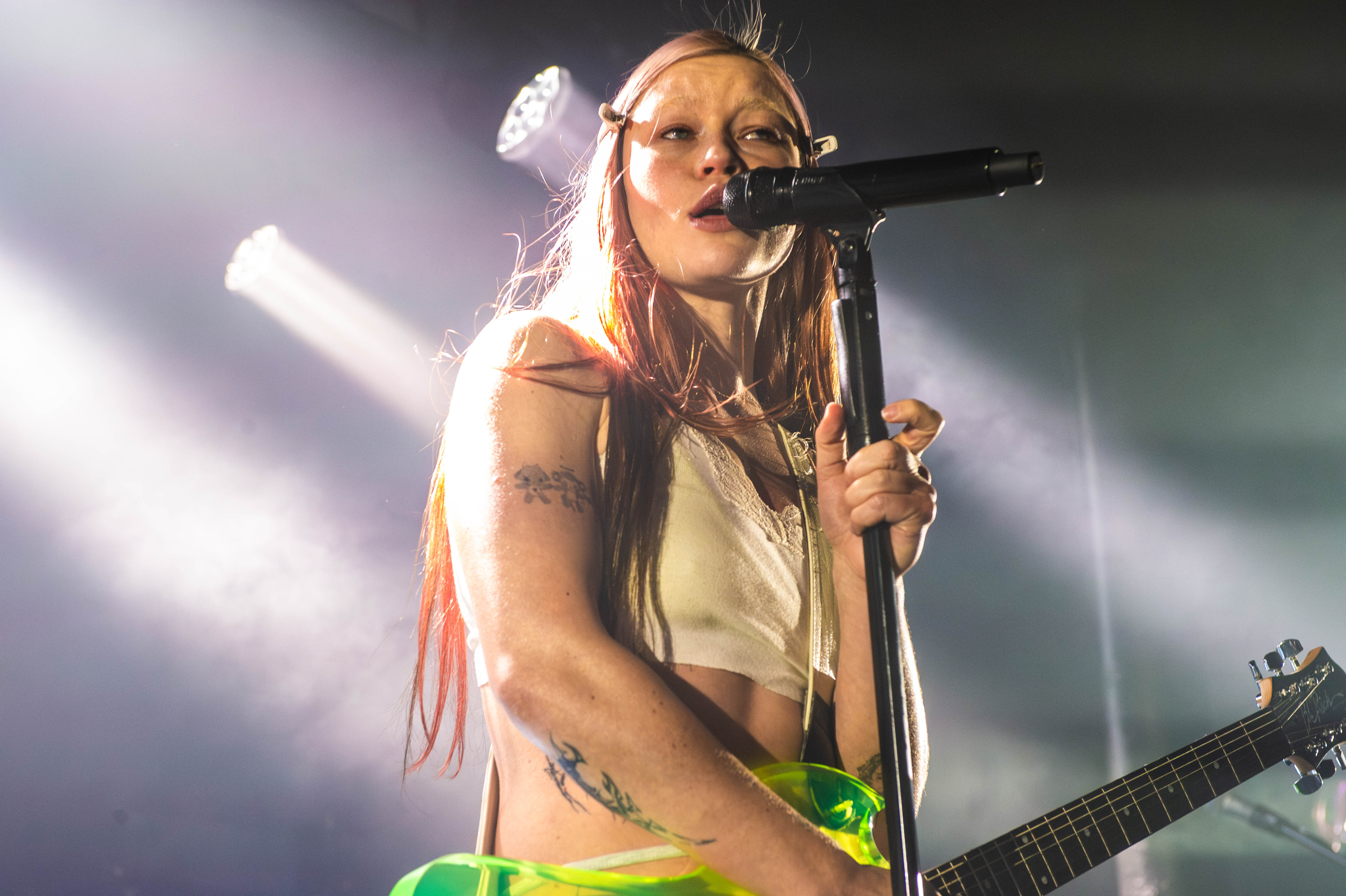 Teasdale's resplendent with her much-talked-about athletic, sharper, chiselled look, with lanky pink hair, dressed all in white, in a crop top, lace garter suspenders, a pair of Adidas JS Wings trainers, and wielding a rare, heavy, lime-green BC Rich Mockingbird guitar.