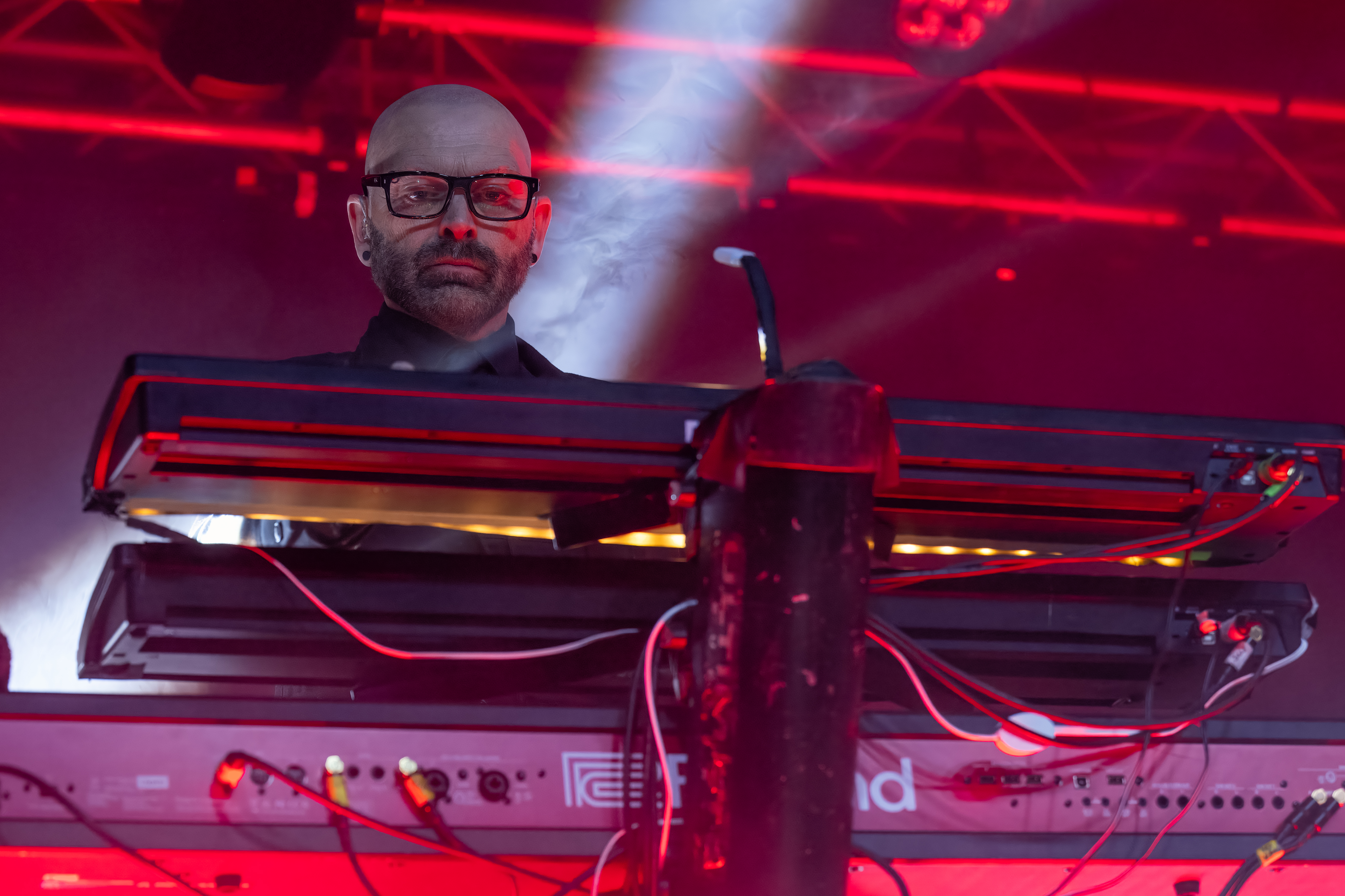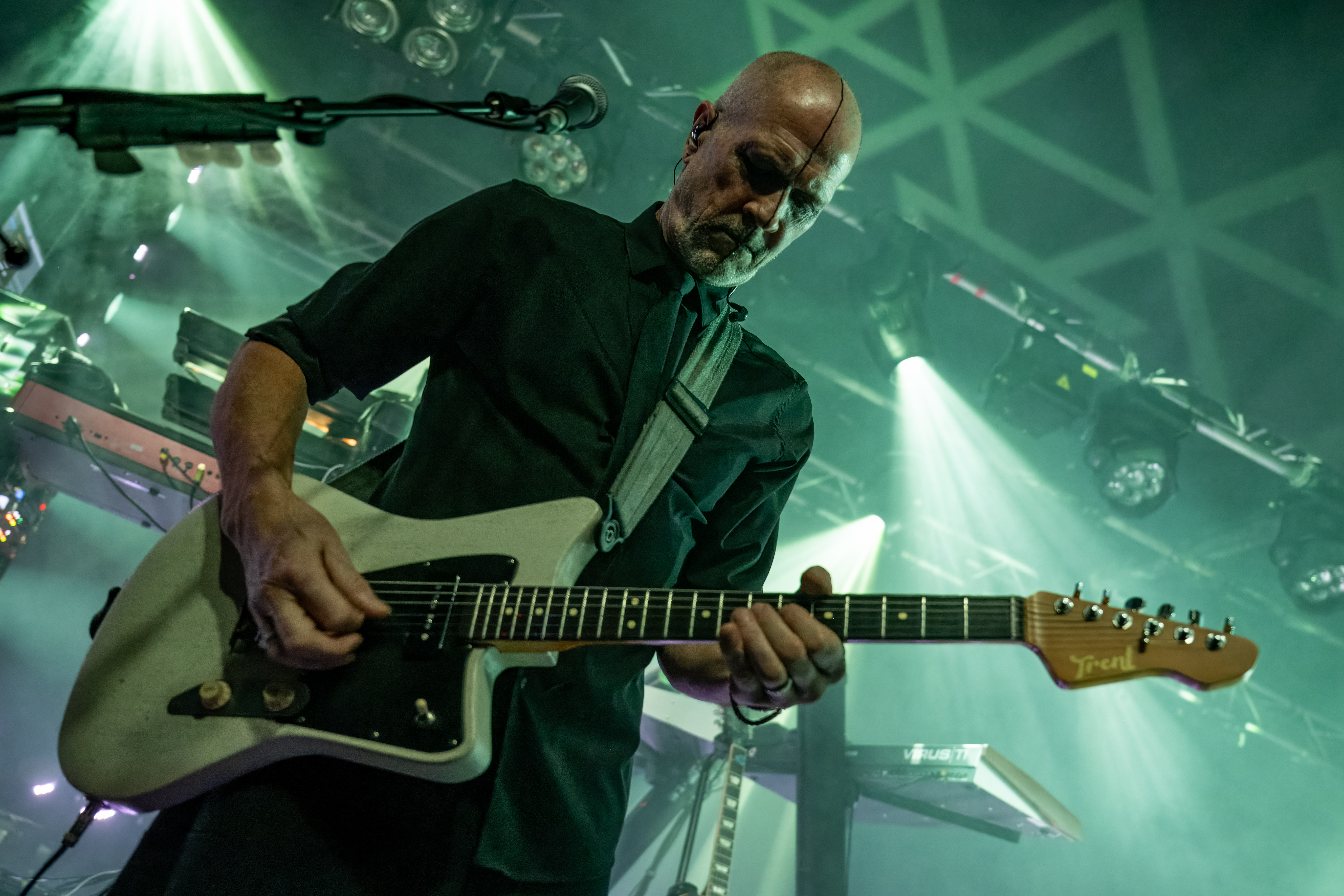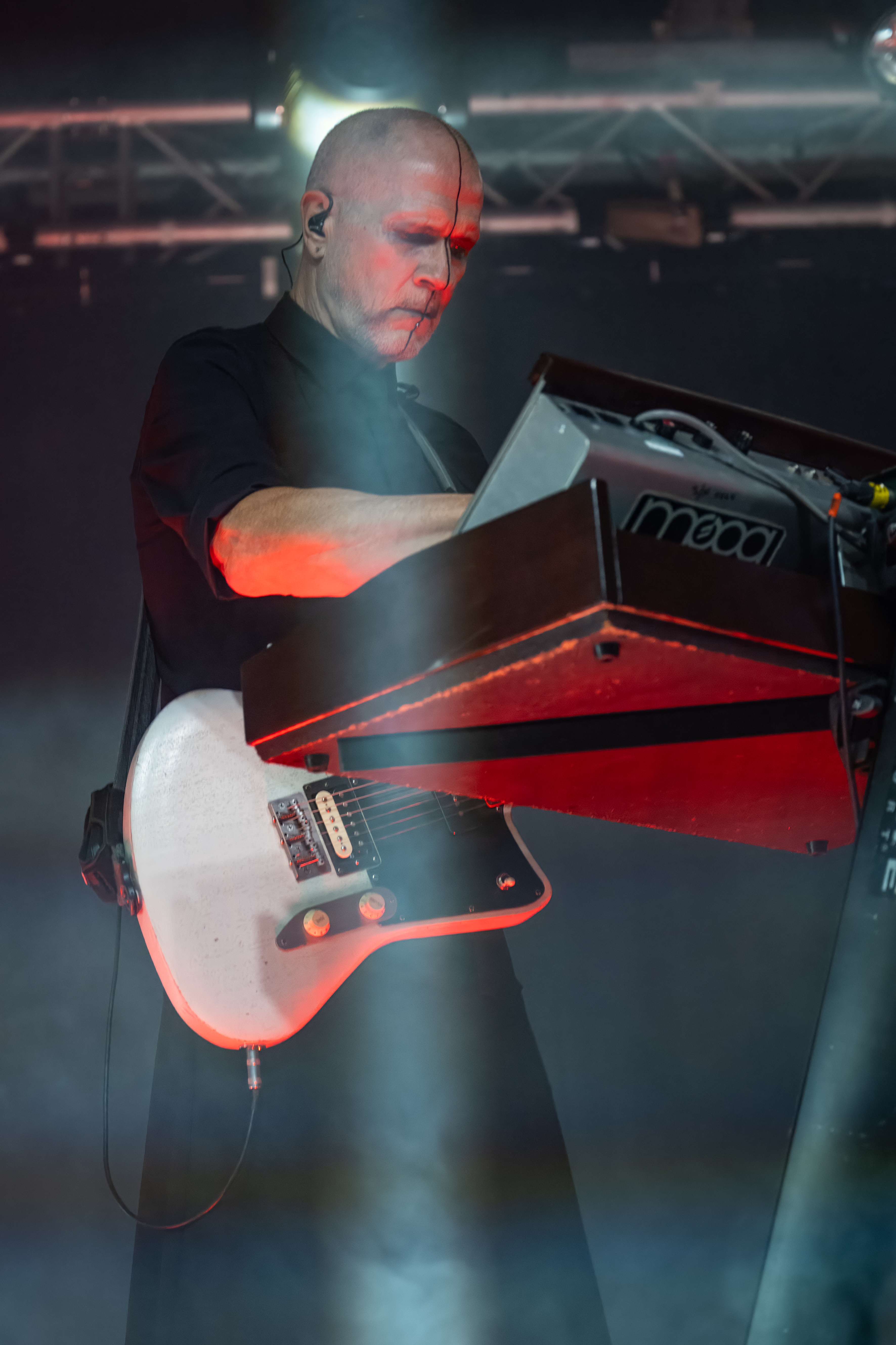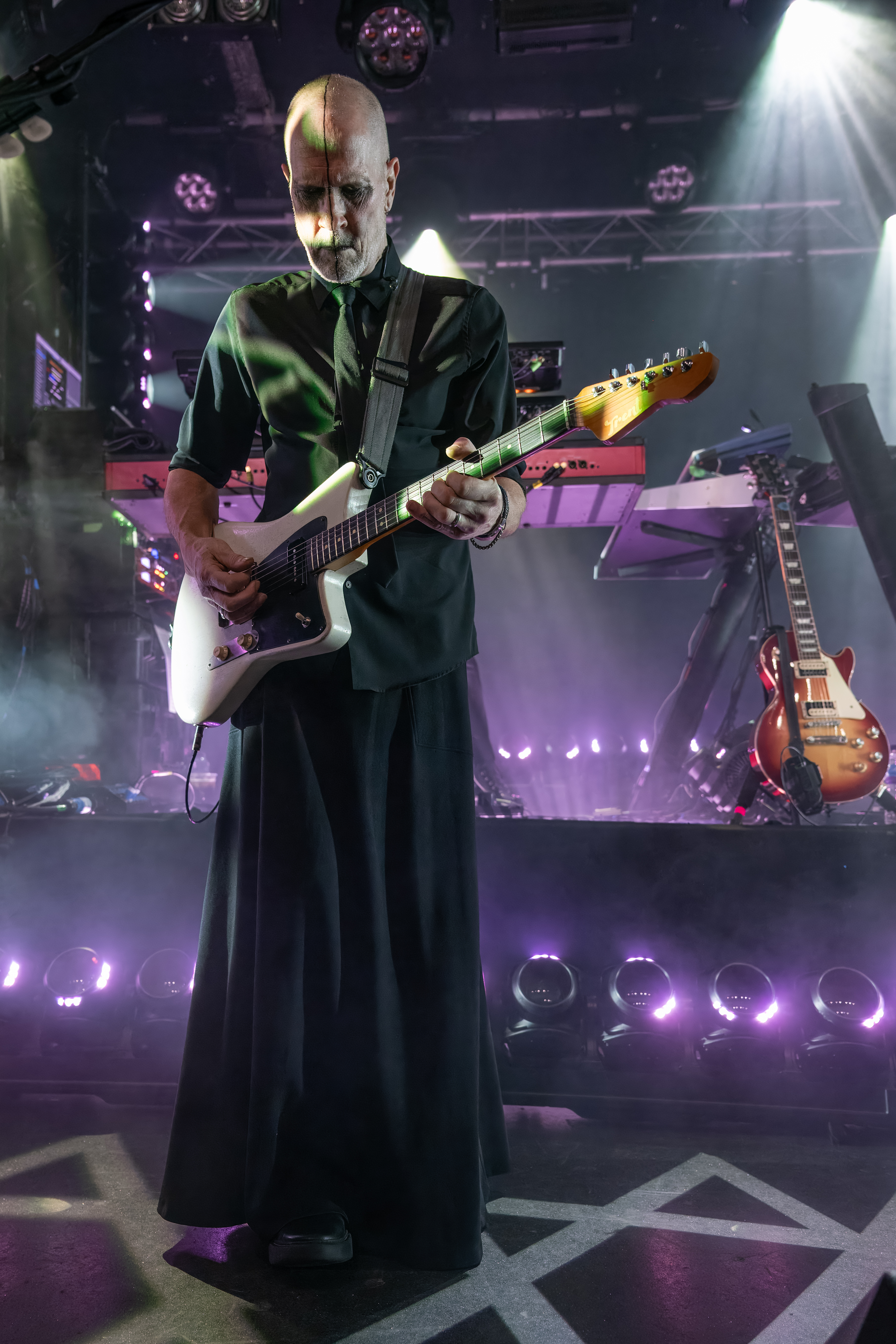 Gary Numan opens with the darkly atmospheric This Wreckage, kicking off this mammoth anniversary celebration with on huge bang. The song has an expertly crafted disjointed energy to it, pairing offbeat, loud, abrasive synths with haunting aggressive vocals and striking dissonant guitar parts. Gary as a songwriter is very good at combining parts that normally wouldn’t work together by thrusting them into his abstract vocal and performance style, crafting a unique yet brand-able and very recognisable sound that stands very consistent across the set. In fact, the translation of these earlier songs from his vast discography is really impressive, the mixes fill the room and the instrumentation and arrangements really stand out; it's impressive to hear.
