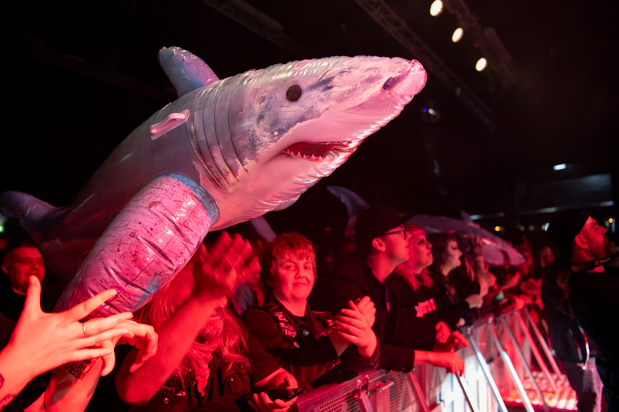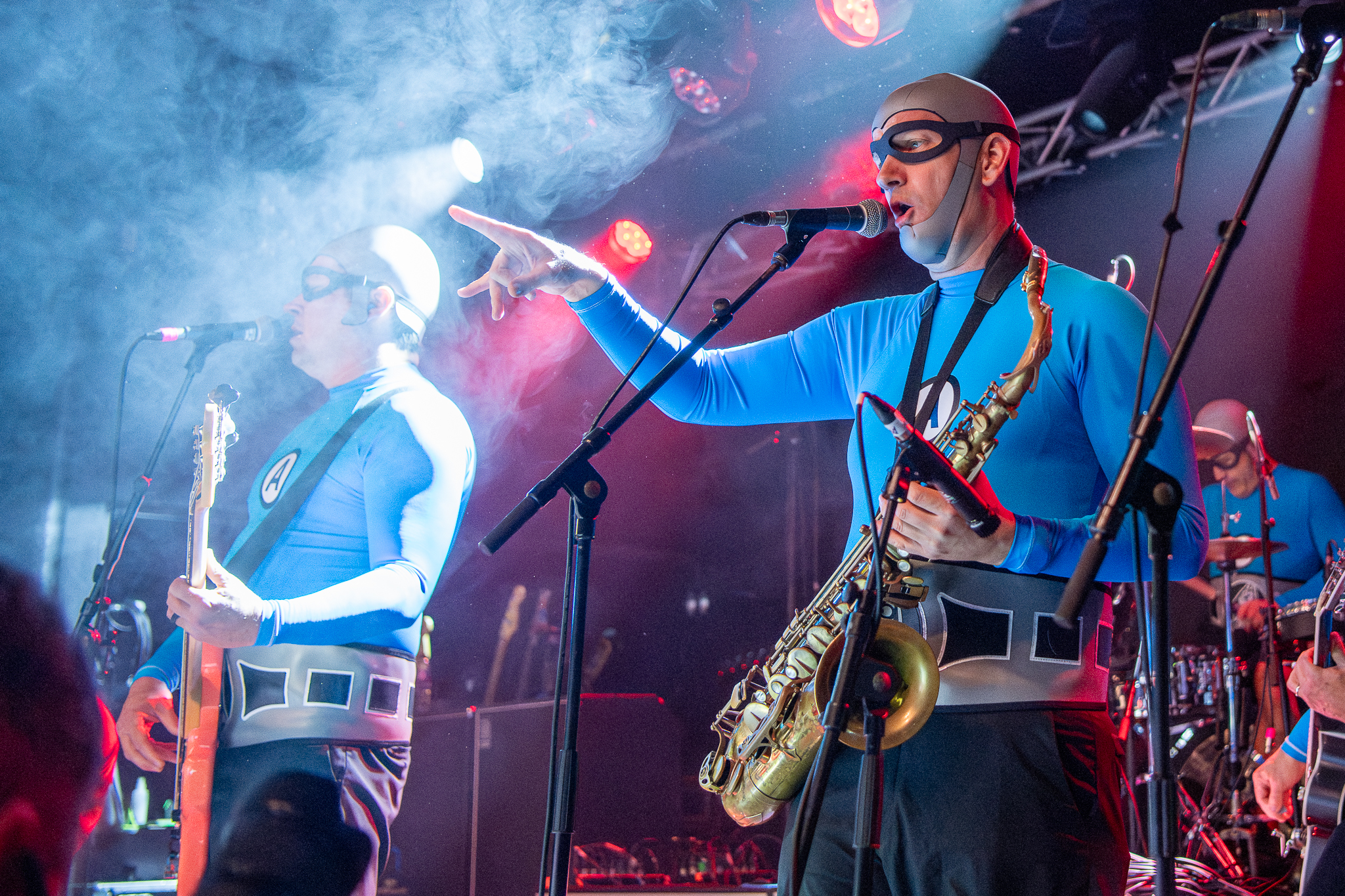 The Aquabats! are next and I know it's going to be quite the performance when eight very sprightly men dressed in blue lycra come bursting onto the stage. Most people find it difficult enough to get a band together, never mind find eight people to wear swimming caps, goggles, wrestling belts and paper crowns, so I'm impressed. They throw four giant blow up sharks into the crowd and we’re off on some sort of madcap underwater Smurfish adventure.