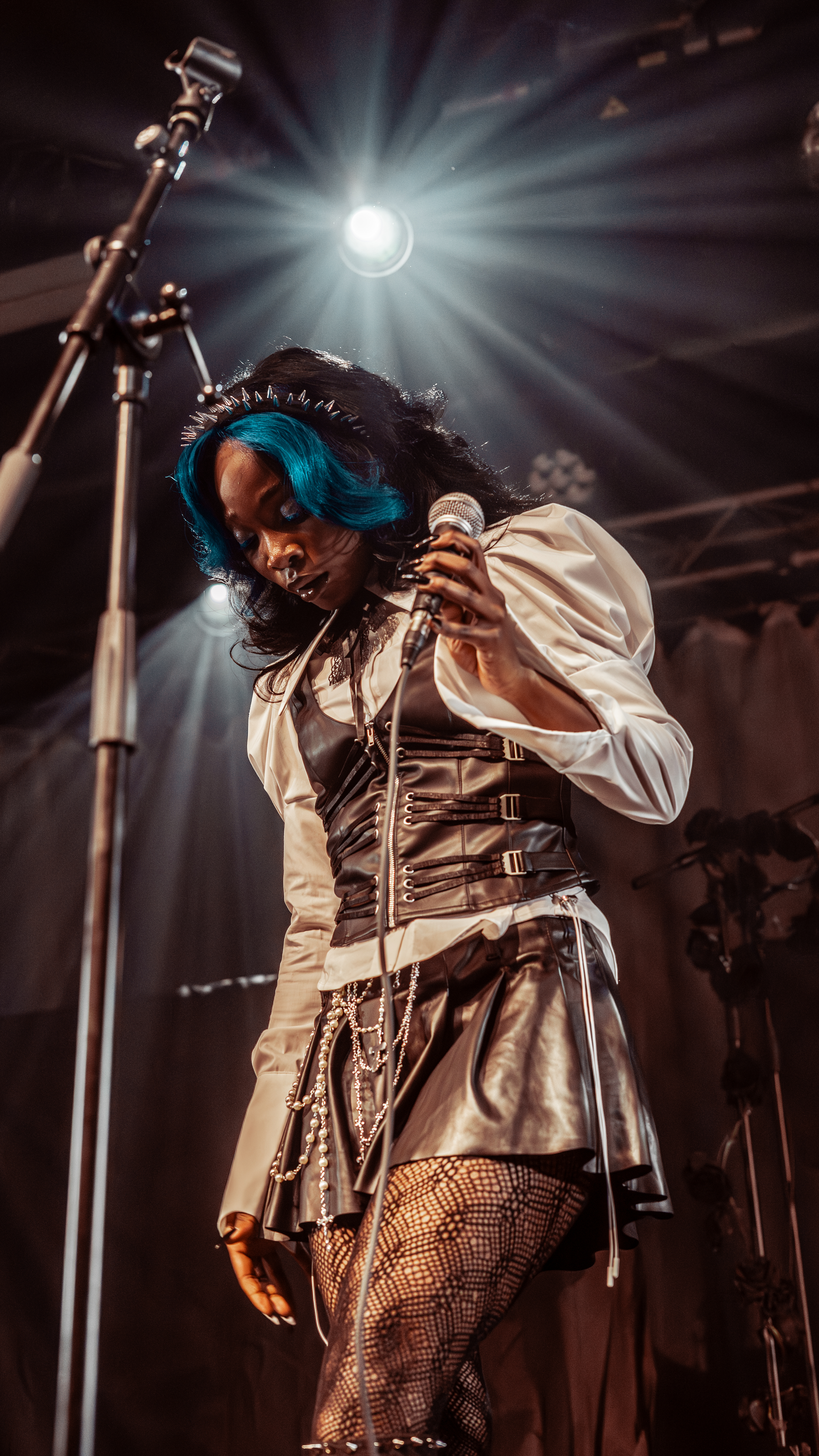 You could tire yourself out just watching her shoes dancing between pedal switches, each stomp coaxing out a wild new sound. Among the most impressive moments is her use of the “Hot Hand” MIDI controller, in the form of a ring which lets her modulate the tone and pitch of her playing by moving her hand in 3D space. It’s completely transfixing every time and allows her to switch between grunge-y, crunchy riffs and acid-house like waves of synthy noise on the fly.
